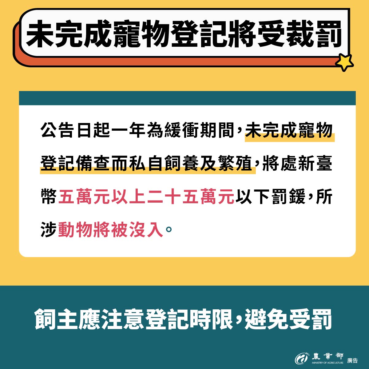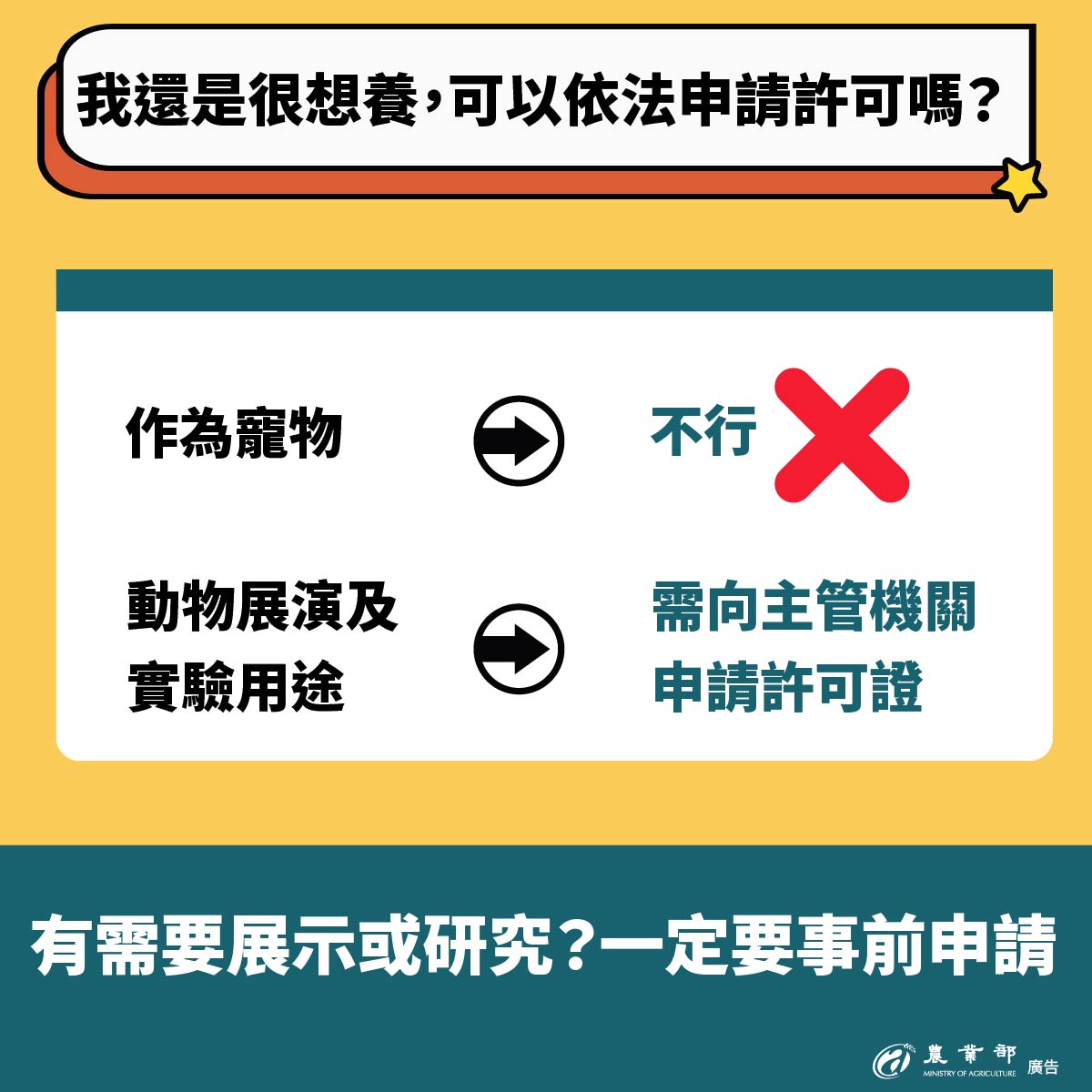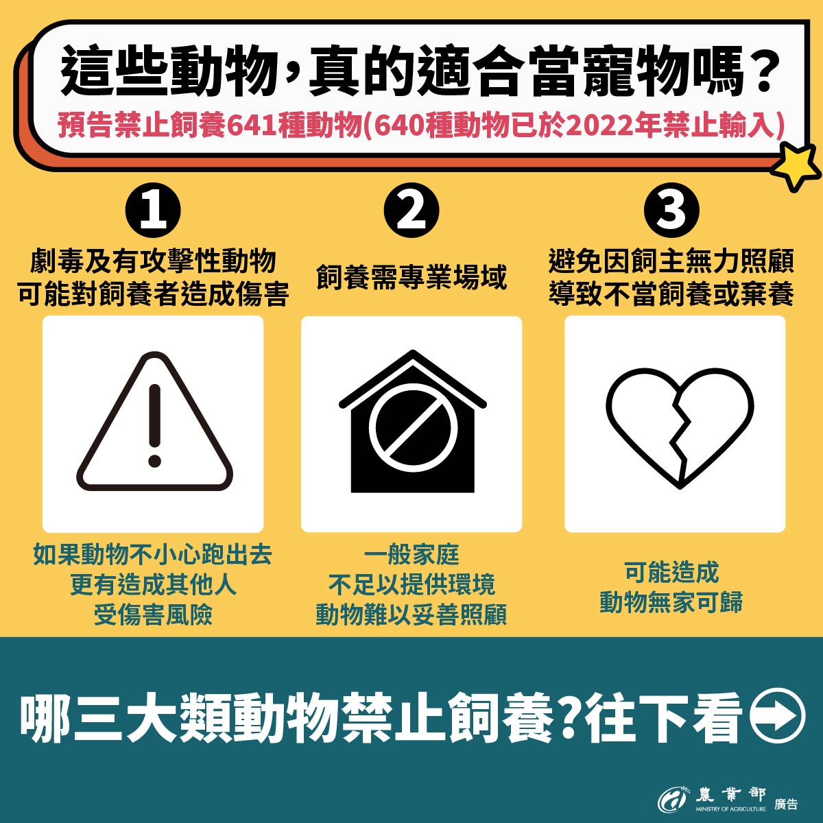 農業部將持續精進我國寵物的分類分級管理制度,並呼籲民眾於飼養動物前,應審慎評估自身環境、能力與責任,擇定合適且有辦法提供良好照護的寵物進行飼養。動物一旦成為家庭成員,飼主應負起最大責任,提供良好環境,並恪守「終養不棄養」的承諾,共同為提升我國動物福利與公共安全而努力。