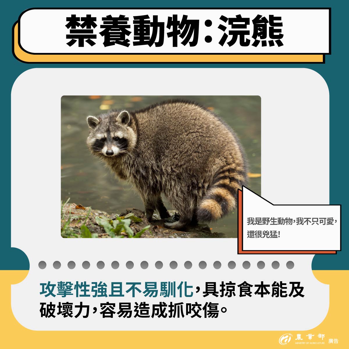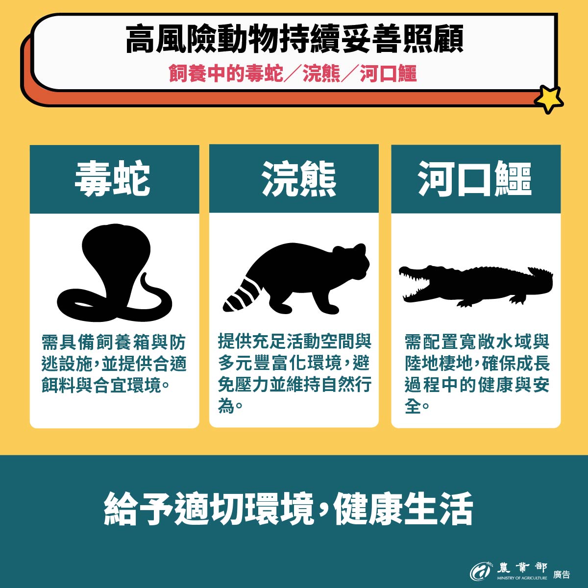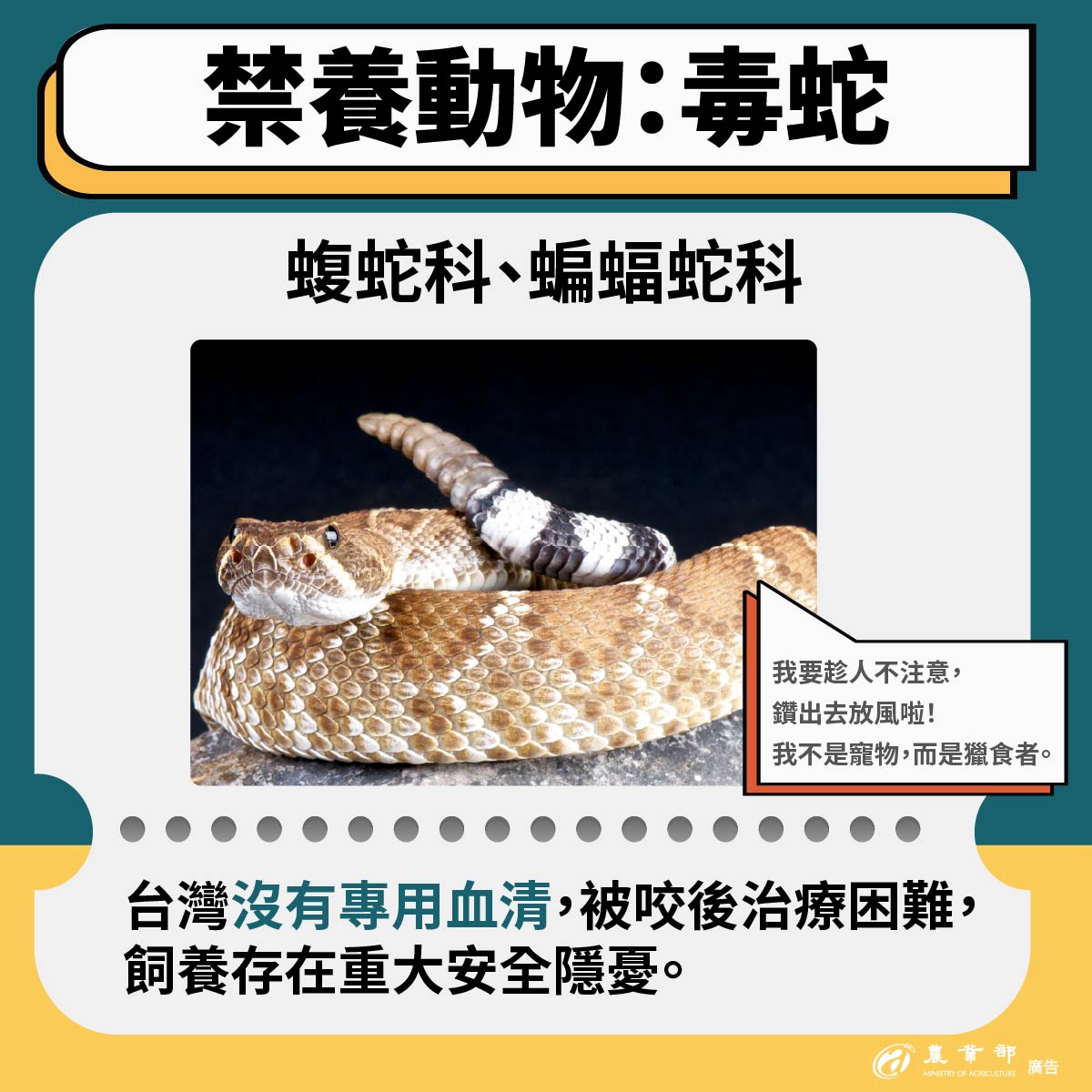 為維護公共安全及保障國人生命安全,農業部今(8)日依據《動物保護法》第8條規定,預告「指定禁止飼養輸入或輸出之動物」修正草案,將禁止一般家庭民眾飼養641種具劇毒或高攻擊性動物,包含蝮蛇科、蝙蝠蛇科、浣熊及河口鱷等,本次預告期間為30日。