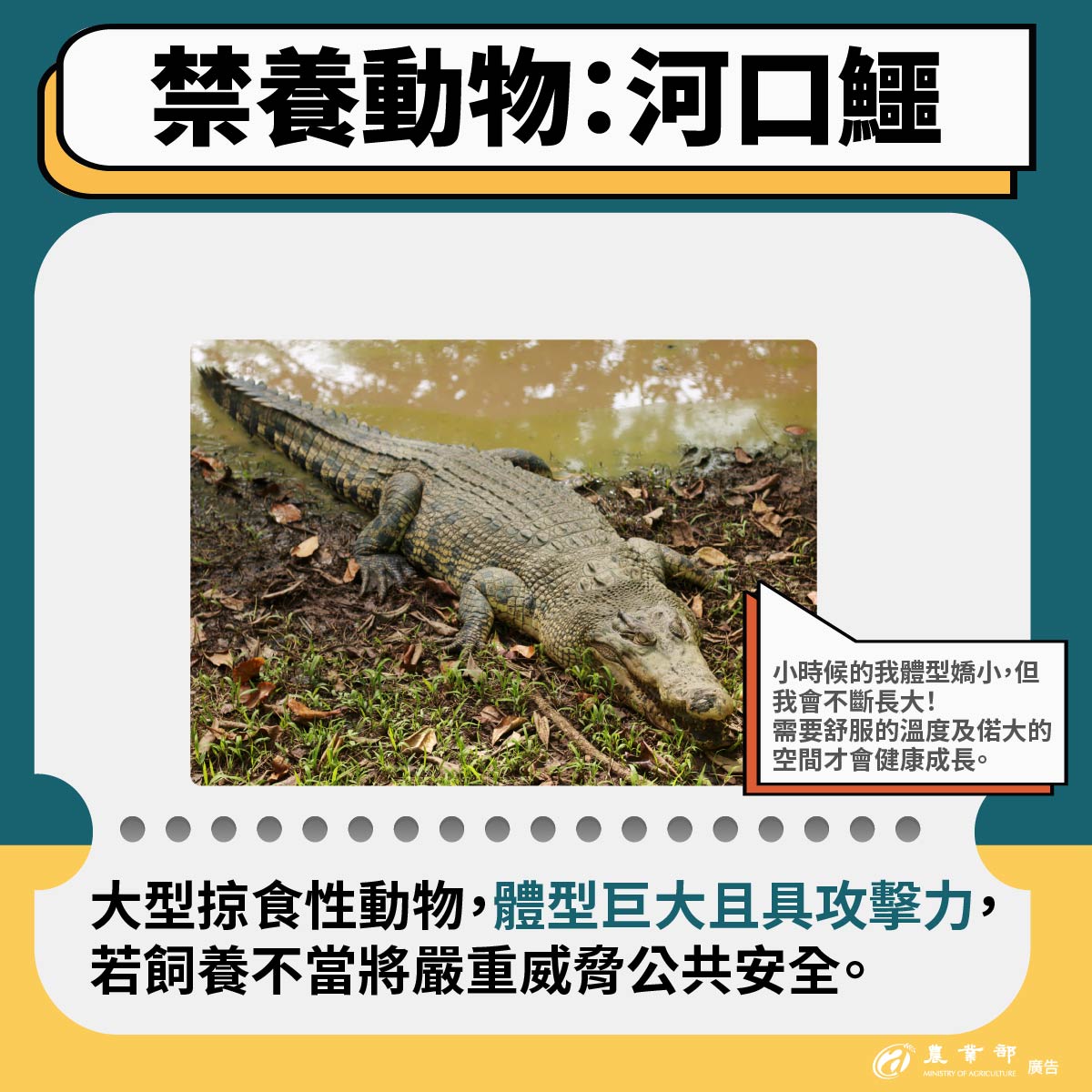 農業部說明,本次預告禁止飼養的641種動物,除河口鱷外,共計有640種為111年起已公告禁止輸入的動物,且是農業部自114年1月起,歷經4次利害關係人會議審慎討論後所達成的共識。禁止飼養的主因在於這些動物多數具有劇毒性,且國內無相關血清可用,或本身具有高度攻擊性,一旦棄養或逸失,將嚴重威脅公共安全。因此,為強化源頭管理及保障人畜安全,必須針對此類具高風險的動物進行飼養管制。